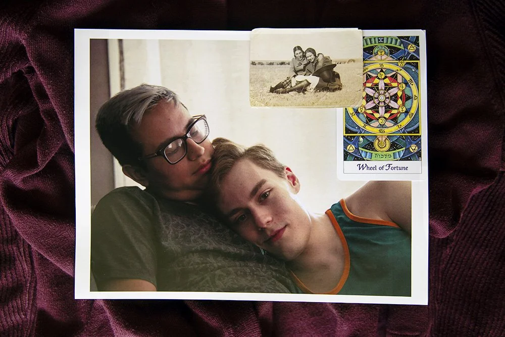Good Luck and Fortune’s Favor were both originally featured in Kat’s How We Were. They chose to keep Good Luck as it was first presented–a simple rehousing of the piece–but Fortune’s Favor was transformed. Originally titled, Fortune (shown below), the work featured the same friends of ours, though several years in the past, paired with a different thrifted photograph, and adorned with another variant of the Wheel of Fortune Tarot card.