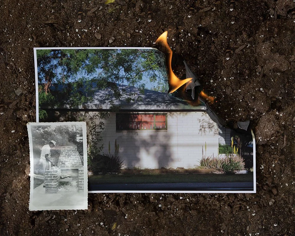 Flashpoint’s fire is, in turn, reflected in Brick by Brick, where a photograph of a different suburban home is actively burning on a pile of dirt. The white brick house is paired with an old photo of someone making use of a brick oven or fireplace. What’s been left burning throughout the decades? What will be left to smolder?